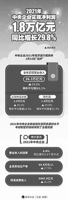 數(shù)據(jù)顯示,2021年,中央企業(yè)實現(xiàn)營業(yè)收入36.3萬億元,同比增長19.5%;實現(xiàn)利潤總額2.4萬億元,同比增長30.3%;實現(xiàn)凈利潤1.8萬億元,同比增長29.8%,均創(chuàng)歷史最好水平。中央企業(yè)全員勞動生產(chǎn)率人均達到69.4萬元,同比增長17.5%;百元營業(yè)收入支付的成本費用為94元,同比下降0.9元;年末資產(chǎn)負債率為64.9%,圓滿完成控制在65%以下的目標。