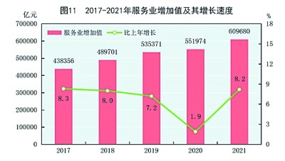 全年批發(fā)和零售業(yè)增加值110493億元,比上年增長(zhǎng)11.3%;交通運(yùn)輸、倉(cāng)儲(chǔ)和郵政業(yè)增加值47061億元,增長(zhǎng)12.1%;住宿和餐飲業(yè)增加值17853億元,增長(zhǎng)14.5%;金融業(yè)增加值91206億元,增長(zhǎng)4.8%;房地產(chǎn)業(yè)增加值77561億元,增長(zhǎng)5.2%;信息傳輸、軟件和信息技術(shù)服務(wù)業(yè)增加值43956億元,增長(zhǎng)17.2%;租賃和商務(wù)服務(wù)業(yè)增加值35350億元,增長(zhǎng)6.2%。全年規(guī)模以上服務(wù)業(yè)企業(yè)營(yíng)業(yè)收入比上年增長(zhǎng)18.7%,利潤(rùn)總額增長(zhǎng)13.4%。(見圖11)