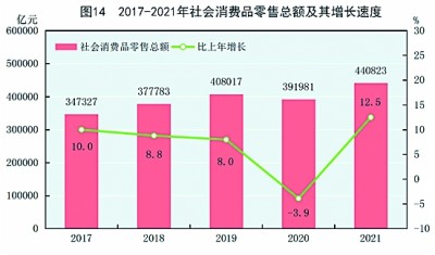 全年社會(huì)消費(fèi)品零售總額440823億元,比上年增長(zhǎng)12.5%。按經(jīng)營(yíng)地統(tǒng)計(jì),城鎮(zhèn)消費(fèi)品零售額381558億元,增長(zhǎng)12.5%;鄉(xiāng)村消費(fèi)品零售額59265億元,增長(zhǎng)12.1%。按消費(fèi)類型統(tǒng)計(jì),商品零售額393928億元,增長(zhǎng)11.8%;餐飲收入額46895億元,增長(zhǎng)18.6%。(見圖14)