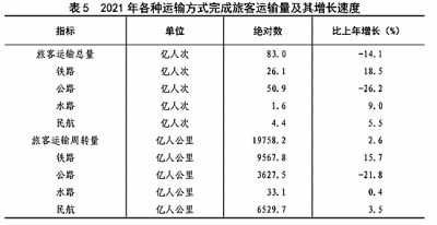 全年旅客運(yùn)輸總量83億人次,比上年下降14.1%。旅客運(yùn)輸周轉(zhuǎn)量19758億人公里,增長(zhǎng)2.6%。(見表5)