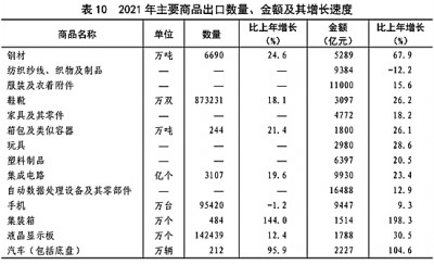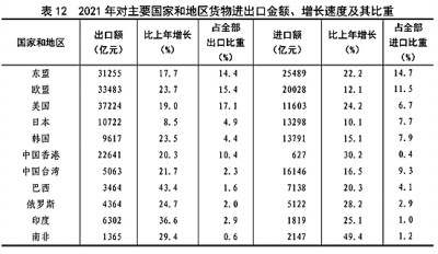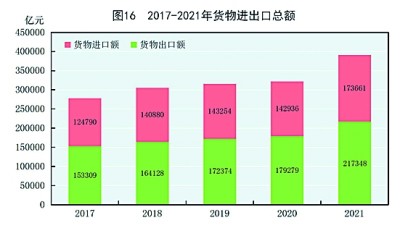 全年貨物進(jìn)出口總額391009億元,比上年增長(zhǎng)21.4%。其中,出口217348億元,增長(zhǎng)21.2%;進(jìn)口173661億元,增長(zhǎng)21.5%。貨物進(jìn)出口順差43687億元,比上年增加7344億元。對(duì)“一帶一路”[44]沿線國(guó)家進(jìn)出口總額115979億元,比上年增長(zhǎng)23.6%。其中,出口65924億元,增長(zhǎng)21.5%;進(jìn)口50055億元,增長(zhǎng)26.4%。(見圖16)(見表9)(見表10)(見表11)(見表12)