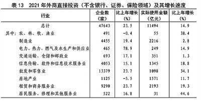 全年外商直接投資(不含銀行、證券、保險(xiǎn)領(lǐng)域)新設(shè)立企業(yè)47643家,比上年增長(zhǎng)23.5%。實(shí)際使用外商直接投資金額11494億元,增長(zhǎng)14.9%,折1735億美元,增長(zhǎng)20.2%。其中“一帶一路”沿線國(guó)家對(duì)華直接投資(含通過部分自由港對(duì)華投資)新設(shè)立企業(yè)5336家,增長(zhǎng)24.3%;對(duì)華直接投資金額743億元,增長(zhǎng)29.4%,折112億美元,增長(zhǎng)36.0%。全年高技術(shù)產(chǎn)業(yè)實(shí)際使用外資3469億元,增長(zhǎng)17.1%,折522億美元,增長(zhǎng)22.1%。(見表13)