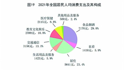 全年全國(guó)居民人均消費(fèi)支出24100元,比上年增長(zhǎng)13.6%,扣除價(jià)格因素,實(shí)際增長(zhǎng)12.6%。其中,人均服務(wù)性消費(fèi)支出[56]10645元,比上年增長(zhǎng)17.8%,占居民人均消費(fèi)支出的比重為44.2%。按常住地分,城鎮(zhèn)居民人均消費(fèi)支出30307元,增長(zhǎng)12.2%,扣除價(jià)格因素,實(shí)際增長(zhǎng)11.1%;農(nóng)村居民人均消費(fèi)支出15916元,增長(zhǎng)16.1%,扣除價(jià)格因素,實(shí)際增長(zhǎng)15.3%。全國(guó)居民恩格爾系數(shù)為29.8%,其中城鎮(zhèn)為28.6%,農(nóng)村為32.7%。(見圖18)(見圖19)