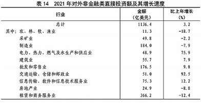 全年對(duì)外非金融類直接投資額7332億元,比上年下降3.5%,折1136億美元,增長(zhǎng)3.2%。其中,對(duì)“一帶一路”沿線國(guó)家非金融類直接投資額203億美元,增長(zhǎng)14.1%。(見表14)