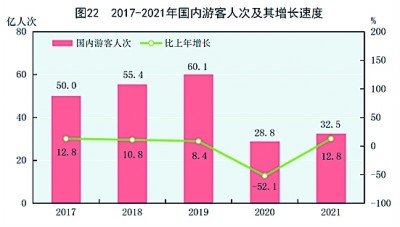 全年國(guó)內(nèi)游客32.5億人次,比上年增長(zhǎng)12.8%。其中,城鎮(zhèn)居民游客23.4億人次,增長(zhǎng)13.4%;農(nóng)村居民游客9.0億人次,增長(zhǎng)11.1%。國(guó)內(nèi)旅游收入29191億元,增長(zhǎng)31.0%。其中,城鎮(zhèn)居民游客花費(fèi)23644億元,增長(zhǎng)31.6%;農(nóng)村居民游客花費(fèi)5547億元,增長(zhǎng)28.4%。(見圖22)