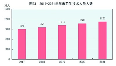 年末全國(guó)共有醫(yī)療衛(wèi)生機(jī)構(gòu)103.1萬(wàn)個(gè),其中醫(yī)院3.7萬(wàn)個(gè),在醫(yī)院中有公立醫(yī)院1.2萬(wàn)個(gè),民營(yíng)醫(yī)院2.5萬(wàn)個(gè);基層醫(yī)療衛(wèi)生機(jī)構(gòu)97.7萬(wàn)個(gè),其中鄉(xiāng)鎮(zhèn)衛(wèi)生院3.5萬(wàn)個(gè),社區(qū)衛(wèi)生服務(wù)中心(站)3.6萬(wàn)個(gè),門診部(所)30.7萬(wàn)個(gè),村衛(wèi)生室59.9萬(wàn)個(gè);專業(yè)公共衛(wèi)生機(jī)構(gòu)1.3萬(wàn)個(gè),其中疾病預(yù)防控制中心3380個(gè),衛(wèi)生監(jiān)督所(中心)2790個(gè)。年末衛(wèi)生技術(shù)人員1123萬(wàn)人,其中執(zhí)業(yè)醫(yī)師和執(zhí)業(yè)助理醫(yī)師427萬(wàn)人,注冊(cè)護(hù)士502萬(wàn)人。醫(yī)療衛(wèi)生機(jī)構(gòu)床位957萬(wàn)張,其中醫(yī)院748萬(wàn)張,鄉(xiāng)鎮(zhèn)衛(wèi)生院144萬(wàn)張。全年總診療人次[70]85.3億人次,出院人數(shù)[71]2.4億人。截至年末,全國(guó)累計(jì)報(bào)告新型冠狀病毒肺炎確診病例102314例,累計(jì)治愈出院病例94792例,累計(jì)死亡4636人。全國(guó)累計(jì)報(bào)告接種新型冠狀病毒疫苗283533萬(wàn)劑次。全國(guó)共有11937家醫(yī)療衛(wèi)生機(jī)構(gòu)提供新型冠狀病毒核酸檢測(cè)服務(wù),總檢測(cè)能力達(dá)到4168萬(wàn)份/天。(見圖23)