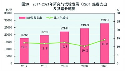 全年研究與試驗(yàn)發(fā)展(R&D)經(jīng)費(fèi)支出27864億元,比上年增長(zhǎng)14.2%,與國(guó)內(nèi)生產(chǎn)總值之比為2.44%,其中基礎(chǔ)研究經(jīng)費(fèi)1696億元。國(guó)家自然科學(xué)基金共資助4.87萬(wàn)個(gè)項(xiàng)目。截至年末,正在運(yùn)行的國(guó)家重點(diǎn)實(shí)驗(yàn)室533個(gè),納入新序列管理的國(guó)家工程研究中心191個(gè),國(guó)家企業(yè)技術(shù)中心1636家,大眾創(chuàng)業(yè)萬(wàn)眾創(chuàng)新示范基地212家。國(guó)家科技成果轉(zhuǎn)化引導(dǎo)基金累計(jì)設(shè)立36支子基金,資金總規(guī)模624億元。國(guó)家級(jí)科技企業(yè)孵化器[60]1287家,國(guó)家備案眾創(chuàng)空間[61]2551家。全年授予專利權(quán)460.1萬(wàn)件,比上年增長(zhǎng)26.4%;PCT專利申請(qǐng)受理量[62]7.3萬(wàn)件。截至年末,有效專利1542.1萬(wàn)件,其中境內(nèi)有效發(fā)明專利270.4萬(wàn)件。每萬(wàn)人口高價(jià)值發(fā)明專利擁有量[63]7.5件。全年商標(biāo)注冊(cè)773.9萬(wàn)件,比上年增長(zhǎng)34.3%。全年共簽訂技術(shù)合同67萬(wàn)項(xiàng),技術(shù)合同成交金額37294億元,比上年增長(zhǎng)32.0%。(見圖20)(見表16)