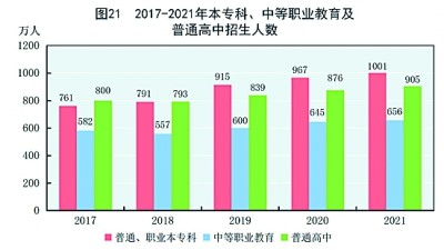 全年研究生教育招生117.7萬(wàn)人,在學(xué)研究生333.2萬(wàn)人,畢業(yè)生77.3萬(wàn)人。普通、職業(yè)本??芠65]招生1001.3萬(wàn)人,在校生3496.1萬(wàn)人,畢業(yè)生826.5萬(wàn)人。中等職業(yè)教育[66]招生656.2萬(wàn)人,在校生1738.5萬(wàn)人,畢業(yè)生484.1萬(wàn)人。普通高中招生905.0萬(wàn)人,在校生2605.0萬(wàn)人,畢業(yè)生780.2萬(wàn)人。初中招生1705.4萬(wàn)人,在校生5018.4萬(wàn)人,畢業(yè)生1587.1萬(wàn)人。普通小學(xué)招生1782.6萬(wàn)人,在校生10779.9萬(wàn)人,畢業(yè)生1718.0萬(wàn)人。特殊教育招生14.9萬(wàn)人,在校生92.0萬(wàn)人,畢業(yè)生14.6萬(wàn)人。學(xué)前教育在園幼兒4805.2萬(wàn)人。九年義務(wù)教育鞏固率為95.4%,高中階段毛入學(xué)率為91.4%。(見圖21)