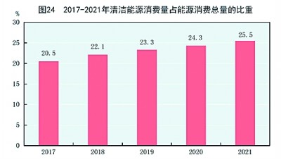 初步核算,全年能源消費(fèi)總量52.4億噸標(biāo)準(zhǔn)煤,比上年增長(zhǎng)5.2%。煤炭消費(fèi)量增長(zhǎng)4.6%,原油消費(fèi)量增長(zhǎng)4.1%,天然氣消費(fèi)量增長(zhǎng)12.5%,電力消費(fèi)量增長(zhǎng)10.3%。煤炭消費(fèi)量占能源消費(fèi)總量的56.0%,比上年下降0.9個(gè)百分點(diǎn);天然氣、水電、核電、風(fēng)電、太陽(yáng)能發(fā)電等清潔能源消費(fèi)量占能源消費(fèi)總量的25.5%,上升1.2個(gè)百分點(diǎn)。重點(diǎn)耗能工業(yè)企業(yè)單位電石綜合能耗下降5.3%,單位合成氨綜合能耗與上年持平,噸鋼綜合能耗下降0.4%,單位電解鋁綜合能耗下降2.1%,每千瓦時(shí)火力發(fā)電標(biāo)準(zhǔn)煤耗下降0.5%。全國(guó)萬(wàn)元國(guó)內(nèi)生產(chǎn)總值二氧化碳排放[78]下降3.8%。(見圖24)