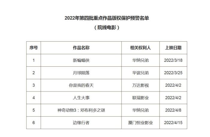2022第四批重點作品版權(quán)保護預(yù)警名單(院線電影)公布