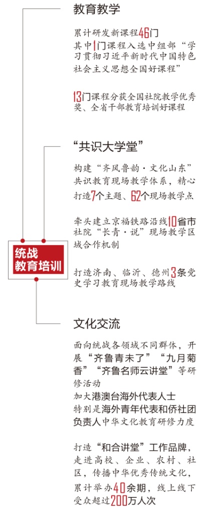 山東省社會主義學(xué)院堅持以習(xí)近平新時代中國特色社會主義思想為指導(dǎo),深入學(xué)習(xí)貫徹習(xí)近平總書記關(guān)于加強和改進統(tǒng)一戰(zhàn)線工作的重要思想,按照《中國共產(chǎn)黨統(tǒng)一戰(zhàn)線工作條例》《社會主義學(xué)院工作條例》的要求,深度發(fā)掘山東傳統(tǒng)文化、紅色文化優(yōu)勢,探索出一條具有山東特色的新時代統(tǒng)戰(zhàn)教培機制,為做好新時代統(tǒng)戰(zhàn)工作打下堅實基礎(chǔ)。