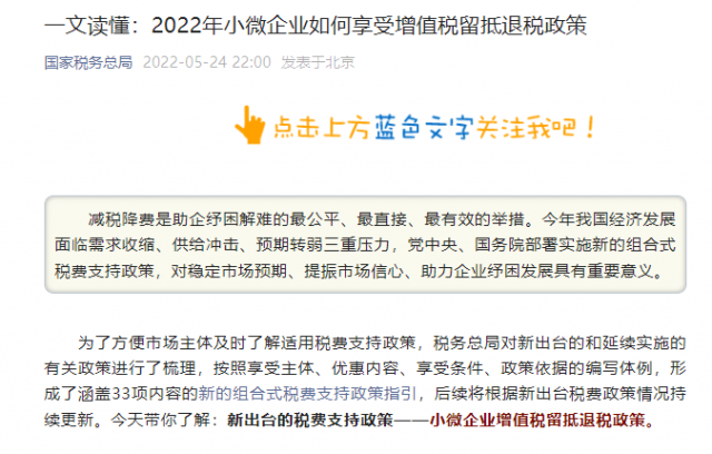 為了方便市場主體及時了解適用稅費支持政策,稅務總局對新出臺的和延續(xù)實施的有關(guān)政策進行了梳理,按照享受主體、優(yōu)惠內(nèi)容、享受條件、政策依據(jù)的編寫體例,形成了涵蓋33項內(nèi)容的新的組合式稅費支持政策指引,后續(xù)將根據(jù)新出臺稅費政策情況持續(xù)更新。今天帶你了解:新出臺的稅費支持政策——小微企業(yè)增值稅留抵退稅政策。