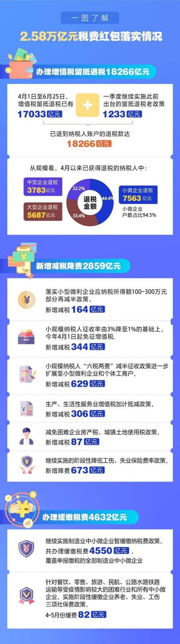 國家稅務總局數(shù)據(jù)顯示,截至6月25日,新的組合式稅費支持政策累計新增退稅減稅降費及緩稅緩費約2.58萬億元。預計上半年新的組合式稅費支持政策將新增退稅減稅降費及緩稅緩費約2.86萬億元。