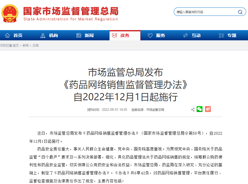 近日,市場監(jiān)管總局發(fā)布《藥品網(wǎng)絡銷售監(jiān)督管理辦法》(國家市場監(jiān)督管理總局令第58號),自2022年12月1日起施行。