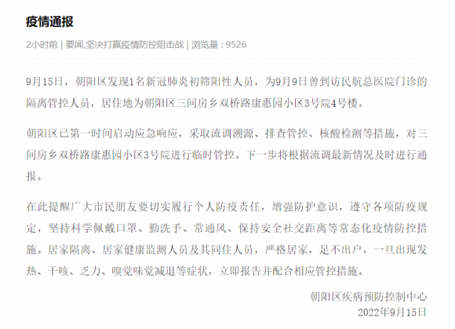 9月15日,北京朝陽區(qū)發(fā)現(xiàn)1名新冠肺炎初篩陽性人員,為9月9日曾到訪民航總醫(yī)院門診的隔離管控人員,居住地為朝陽區(qū)三間房鄉(xiāng)雙橋路康惠園小區(qū)3號院4號樓。
