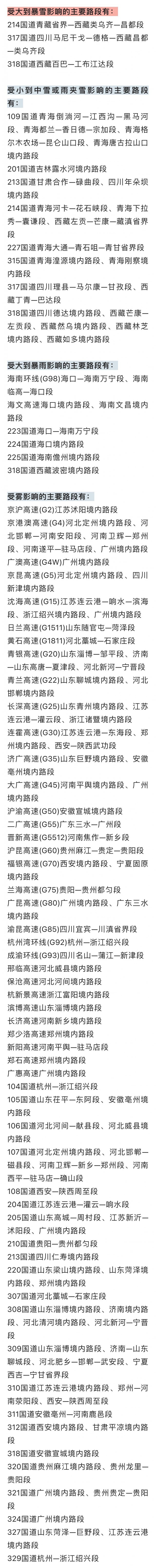 交通運輸部:多條道路受降雪、降雨等天氣影響
