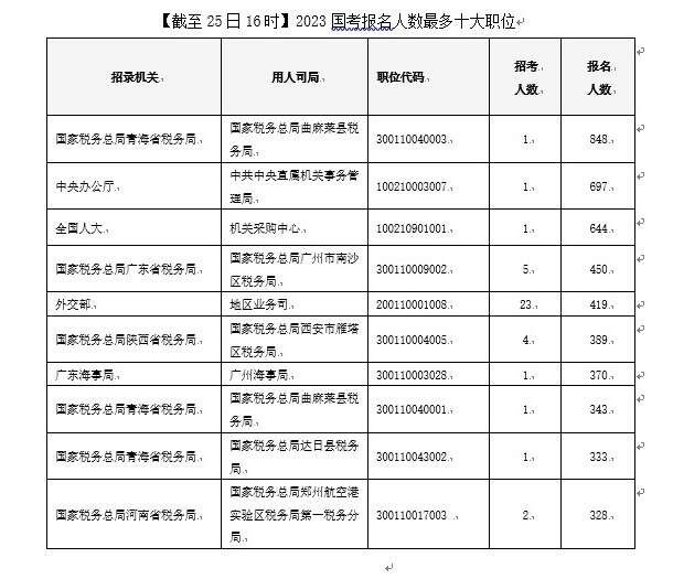 截至10月25日16時,2023國考報名首日的“人氣之星”是國家稅務總局青海省稅務局曲麻萊縣稅務局這一職位,僅招錄1人,已有848人提交報名申請,報名首日競爭比已高達848:1。