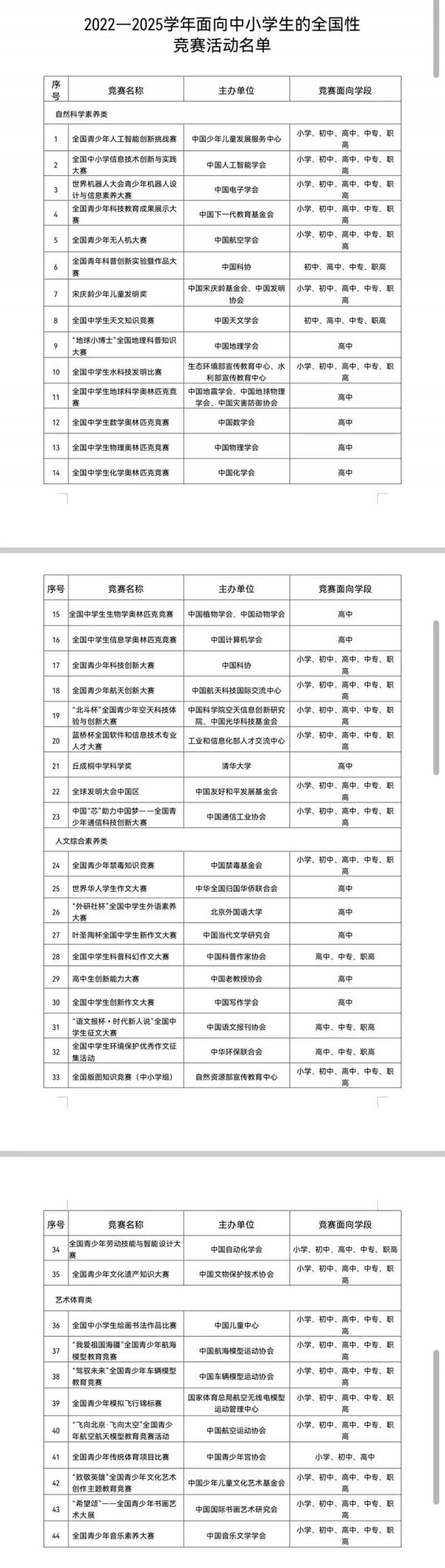 教育部提示,有關(guān)市場主體要合法合規(guī)經(jīng)營,不要違規(guī)舉辦面向中小學生的競賽活動,對于違規(guī)競賽活動,教育部門將會同市場監(jiān)管等部門依法依規(guī)嚴肅處理;廣大學生和家長要擦亮眼睛,凡是未列入“面向中小學生的全國性競賽活動名單”的均是違規(guī)競賽,名單內(nèi)沒有面向義務(wù)教育階段學生的學科類競賽,所有競賽均不得向?qū)W生和家長收取任何費用,競賽及競賽產(chǎn)生的結(jié)果均不作為中小學招生入學的依據(jù),也不作為高考加分項目;各級教育行政部門和學校要加強政策宣傳和提醒,引導(dǎo)廣大家長、學生理性看待各類競賽活動,自覺抵制違規(guī)競賽。