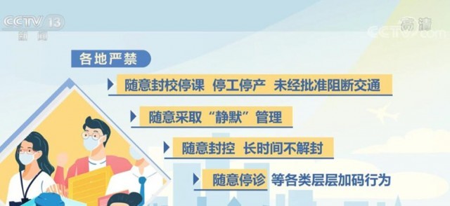 《通知》明確要求,各地嚴(yán)禁隨意封校停課、停工停產(chǎn)、未經(jīng)批準(zhǔn)阻斷交通,隨意采取“靜默”管理,隨意封控、長時(shí)間不解封,隨意停診等各類層層加碼行為,加大通報(bào)、公開曝光力度,對造成嚴(yán)重后果的依法依規(guī)嚴(yán)肅追責(zé)。對于沒有發(fā)生疫情的地區(qū),要嚴(yán)格按照第九版防控方案確定的范圍對風(fēng)險(xiǎn)崗位、重點(diǎn)人員開展核酸檢測,既不能隨意擴(kuò)大核酸檢測范圍,也不能隨意擴(kuò)大人員管控、社區(qū)封控、隔離轉(zhuǎn)運(yùn)范圍。糾正“一天兩檢”“一天三檢”等不科學(xué)做法。疫情發(fā)生地要分類有序做好外地滯留人員疏解,目的地不得拒絕接受滯留人員返回,既要避免疫情外溢,也不得加碼管控。