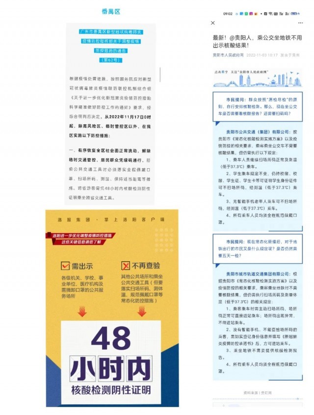 最早宣布取消的是貴陽市。11月3日,“貴陽市人民政府網(wǎng)”發(fā)布《最新!@貴陽人,乘公交坐地鐵不用出示核酸結(jié)果!》,宣布根據(jù)貴陽市《常態(tài)化核酸檢測(cè)實(shí)施方案》以及疫情防控的相關(guān)要求,乘客乘坐公交車和地鐵時(shí)均不需要查驗(yàn)核酸檢測(cè)結(jié)果。