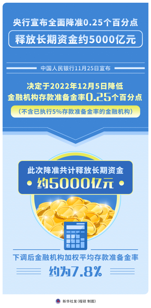 11月25日中國(guó)人民銀行宣布,決定于2022年12月5日降低金融機(jī)構(gòu)存款準(zhǔn)備金率0.25個(gè)百分點(diǎn)(不含已執(zhí)行5%存款準(zhǔn)備金率的金融機(jī)構(gòu))。這是年內(nèi)第二次降準(zhǔn),今年首次降準(zhǔn)已在4月落地。兩次降準(zhǔn)共降低金融機(jī)構(gòu)存款準(zhǔn)備金率0.5個(gè)百分點(diǎn)、釋放長(zhǎng)期資金超萬億元,金融機(jī)構(gòu)加權(quán)平均存款準(zhǔn)備金率降至約7.8%。