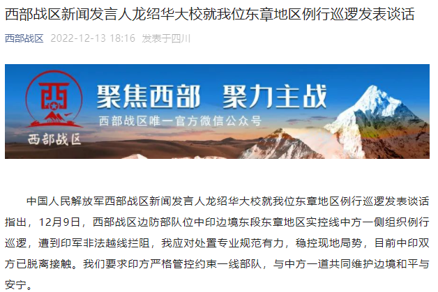 中國人民解放軍西部戰(zhàn)區(qū)新聞發(fā)言人龍紹華大校就我位東章地區(qū)例行巡邏發(fā)表談話指出,12月9日,西部戰(zhàn)區(qū)邊防部隊位中印邊境東段東章地區(qū)實控線中方一側組織例行巡邏,遭到印軍非法越線攔阻,我應對處置專業(yè)規(guī)范有力,穩(wěn)控現(xiàn)地局勢,目前中印雙方已脫離接觸。我們要求印方嚴格管控約束一線部隊,與中方一道共同維護邊境和平與安寧。