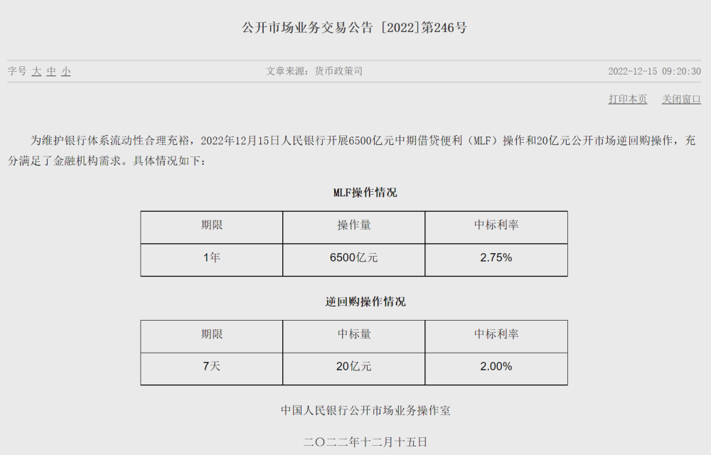 為維護(hù)銀行體系流動性合理充裕,12月15日中國人民銀行開展6500億元中期借貸便利(MLF)操作和20億元公開市場逆回購操作,充分滿足了金融機構(gòu)需求,中標(biāo)利率均與前次持平。