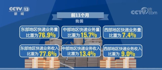 前11個月,我國東、中、西部地區(qū)快遞業(yè)務量比重分別為76.9%、15.7%和7.4%,業(yè)務收入比重分別為77.6%、13.4%和9.0%。與去年同期相比,東部地區(qū)快遞業(yè)務量比重下降1.3個百分點,快遞業(yè)務收入比重下降0.6個百分點。中部地區(qū)快遞業(yè)務量比重上升1.2個百分點,快遞業(yè)務收入比重上升0.5個百分點。西部地區(qū)快遞業(yè)務量比重上升0.1個百分點,快遞業(yè)務收入比重上升0.1個百分點。