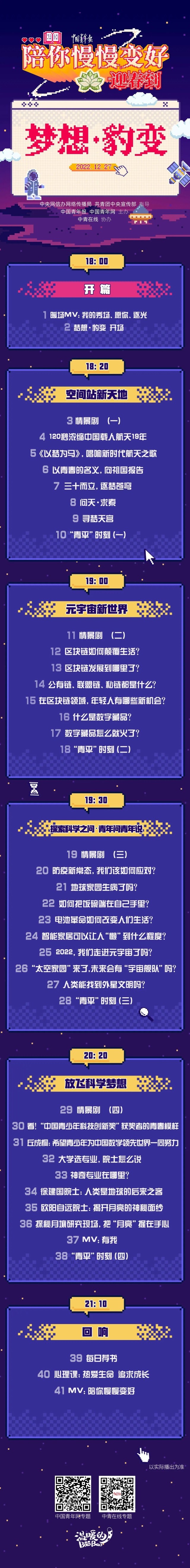 在這場聯(lián)播節(jié)目中,4位年輕記者將通過自己的經(jīng)歷和故事,和大家一起回顧2022年與科技創(chuàng)新有關(guān)的瞬間,重溫那些帶給我們“夢想”和“豹變”的激情時刻。聯(lián)播由空間站新天地、元宇宙新世界、探索科學之問、放飛科學夢想等四大篇章組成,重磅環(huán)節(jié)“探索科學之問”將聯(lián)合北京市科協(xié),共同推出聯(lián)名款“青年問青年說”,青年科學家和大學生一起盤點這些熱點科技問題:防疫新常態(tài),我們該如何應對?極端天氣頻發(fā),地球家園生病了?2022年,我們走進元宇宙了嗎?“太空家園”來了,未來會不會有“宇宙艦隊”…… 12月27日,我們不見不散。