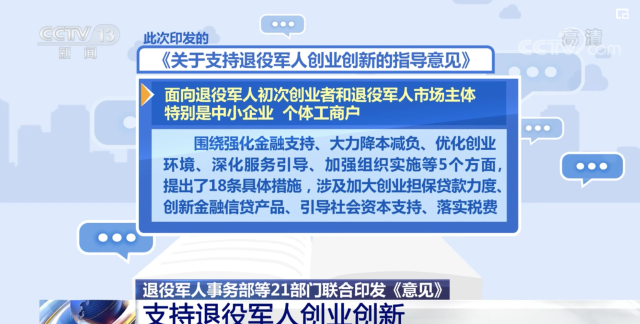 此次印發(fā)的《關(guān)于支持退役軍人創(chuàng)業(yè)創(chuàng)新的指導(dǎo)意見》,面向退役軍人初次創(chuàng)業(yè)者和退役軍人市場主體,特別是中小企業(yè)、個體工商戶。圍繞強(qiáng)化金融支持、大力降本減負(fù)、優(yōu)化創(chuàng)業(yè)環(huán)境、深化服務(wù)引導(dǎo)、加強(qiáng)組織實(shí)施等5個方面,提出了18條具體措施,涉及加大創(chuàng)業(yè)擔(dān)保貸款力度、創(chuàng)新金融信貸產(chǎn)品、引導(dǎo)社會資本支持、落實(shí)稅費(fèi)減免、緩解租金壓力、優(yōu)化供地保障、落實(shí)補(bǔ)貼優(yōu)惠、完善公共服務(wù)、開展創(chuàng)業(yè)培訓(xùn)、加強(qiáng)個體工商戶引導(dǎo)扶持等,進(jìn)一步提升退役軍人創(chuàng)業(yè)創(chuàng)新能力,培育壯大退役軍人市場主體,帶動更多退役軍人就業(yè)。