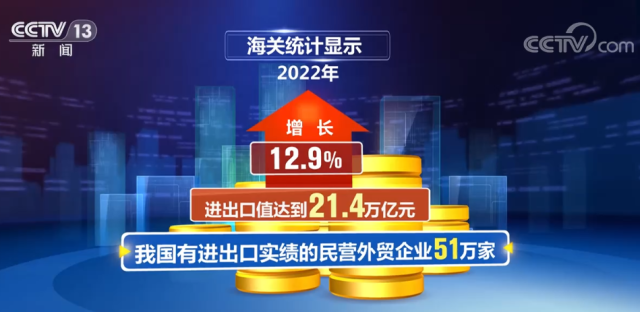 央視網(wǎng)消息:海關總署新聞發(fā)言人呂大良介紹,2022年,我國有進出口實績的民營外貿(mào)企業(yè)51萬家,進出口值達到21.4萬億元,進出口規(guī)模年度占比首次超過一半,外貿(mào)“穩(wěn)定器”作用持續(xù)發(fā)揮。