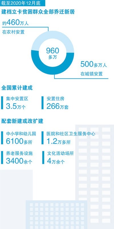 習近平總書記強調(diào):“易地搬遷是解決一方水土養(yǎng)不好一方人、實現(xiàn)貧困群眾跨越式發(fā)展的根本途徑,也是打贏脫貧攻堅戰(zhàn)的重要途徑?!秉h的十八大以來,全國累計建成集中安置區(qū)3.5萬個、安置住房266萬套。到2020年底,全國易地扶貧搬遷規(guī)劃建設任務全面完成,近千萬生活在“一方水土難養(yǎng)一方人”地方的建檔立卡貧困人口實現(xiàn)易地扶貧搬遷,搬入新家園、開啟新生活。