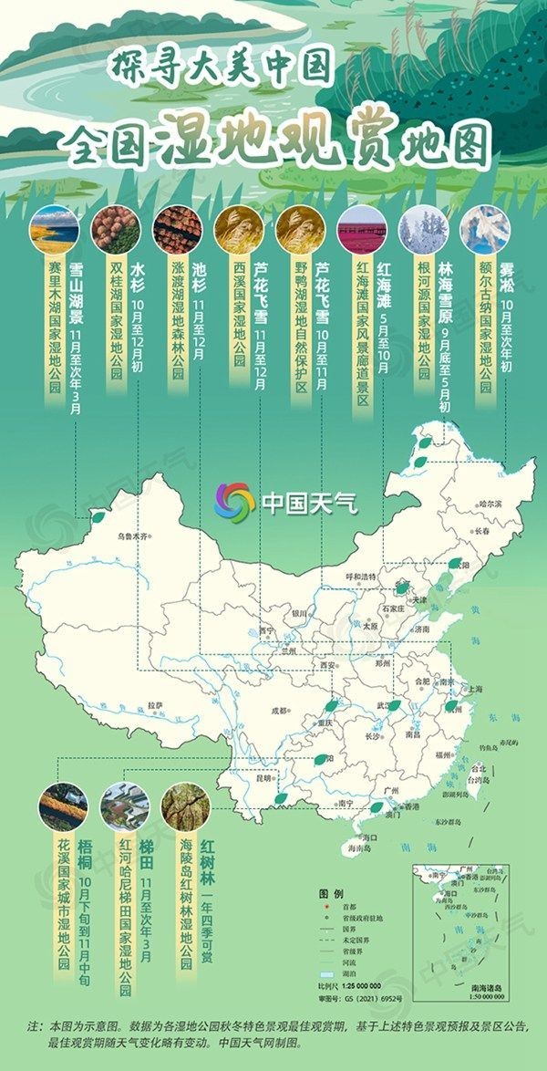 濕地不僅能為人們提供四季不同的可觀賞景觀,還是十分重要的自然生態(tài)系統(tǒng),為大量的動植物提供棲息地,既能保護(hù)生物的多樣性,也能調(diào)節(jié)氣候、凈化水質(zhì)。有興趣的朋友可根據(jù)最佳觀賞期前往觀賞,提醒大家出游仍需注意佩戴口罩,做好健康防護(hù)工作。(中國天氣網(wǎng) 文/江漪 設(shè)計/任成英 數(shù)據(jù)支持/李靚)