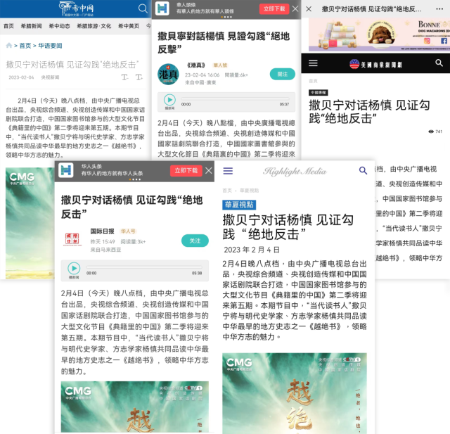 未播先熱!這部當代人幾乎聞所未聞的千古“奇書”,一下子吸引了海內(nèi)外網(wǎng)民目光。海內(nèi)外諸多媒體迅速關(guān)注,紛紛報道。截至目前,歐洲華語廣播電臺、匈牙利聯(lián)合報、北歐時報等數(shù)十家海外媒體對第二季內(nèi)容的轉(zhuǎn)發(fā)和報道,已輻射10多個國家和地區(qū),在海外再次掀起“典籍熱”。