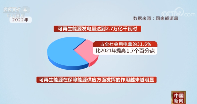 2022年,中國可再生能源呈現(xiàn)發(fā)展速度快、運行質(zhì)量好、利用水平高、產(chǎn)業(yè)競爭力強的良好態(tài)勢,取得了諸多里程碑式的新成績。2022年,中國風(fēng)電、光伏發(fā)電量達(dá)到1.19萬億千瓦時,比2021年增加2073億千瓦時,同比增長21%,接近全國城鄉(xiāng)居民生活用電量。2022年,可再生能源發(fā)電量達(dá)到2.7萬億千瓦時,占全社會用電量的31.6%,比2021年提高1.7個百分點,可再生能源在保障能源供應(yīng)方面發(fā)揮的作用越來越明顯,可再生能源新增裝機已成為中國電力新增裝機的主體。