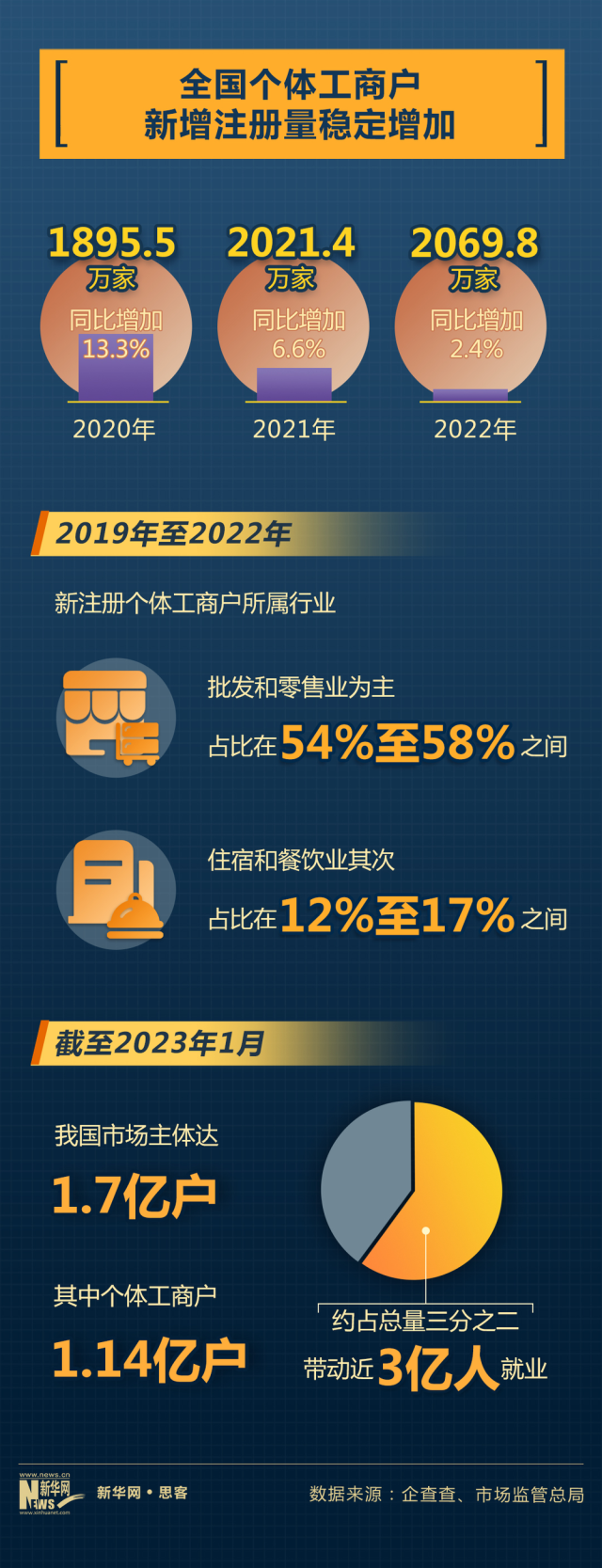近日市場監(jiān)管總局統(tǒng)計(jì)顯示,截至2023年1月,我國市場主體達(dá)1.7億戶,其中個(gè)體工商戶1.14億戶,約占總量三分之二,帶動(dòng)近3億人就業(yè)。