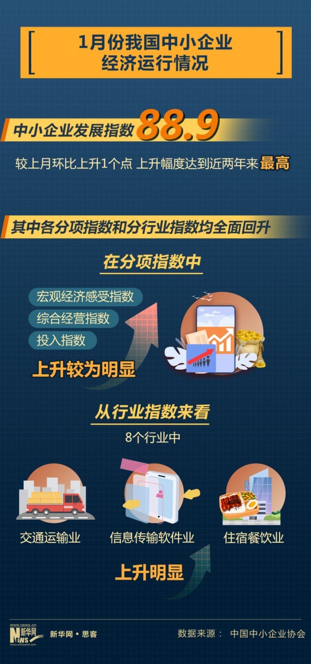 近日中國中小企業(yè)協(xié)會(huì)公布我國中小企業(yè)經(jīng)濟(jì)運(yùn)行情況。2023年1月份,中國中小企業(yè)發(fā)展指數(shù)為88.9,比去年12月回升1個(gè)點(diǎn),上升幅度達(dá)到近兩年來最高。其中,企業(yè)發(fā)展信心回升,反映企業(yè)信心狀況的宏觀經(jīng)濟(jì)感受指數(shù)為98.7,比上月上升2.1點(diǎn)。市場預(yù)期有所提振,市場指數(shù)為80.7,環(huán)比上升0.9點(diǎn)。