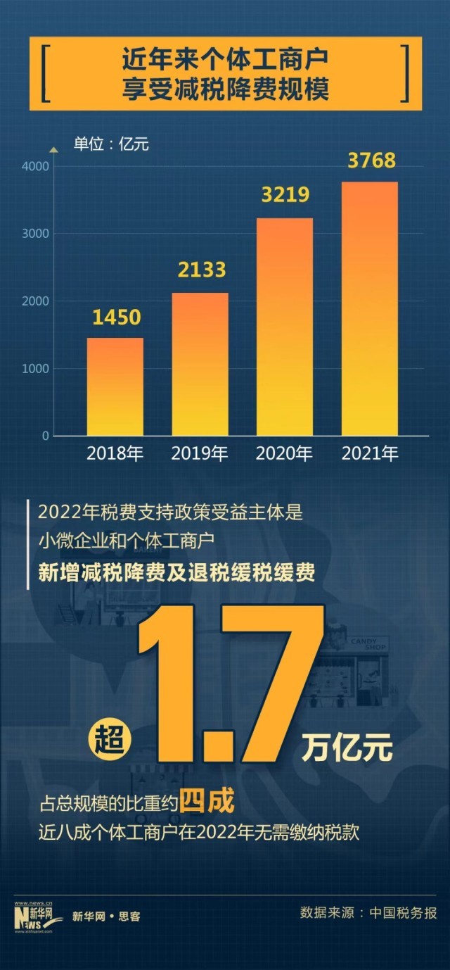 2021年,我國將包括個(gè)體工商戶在內(nèi)的小規(guī)模納稅人增值稅免稅月銷售額從10萬元提高到15萬元,對個(gè)體工商戶應(yīng)納稅所得額不超過100萬元的部分,在已有優(yōu)惠政策的基礎(chǔ)上減半征收個(gè)人所得稅。