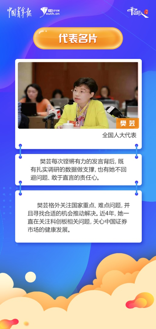 2020年,在十三屆全國人大三次會(huì)議上,她提出改革不適應(yīng)的監(jiān)管模式、依法實(shí)施注冊備案制等7條建議,推動(dòng)了新版證券法改革落地。