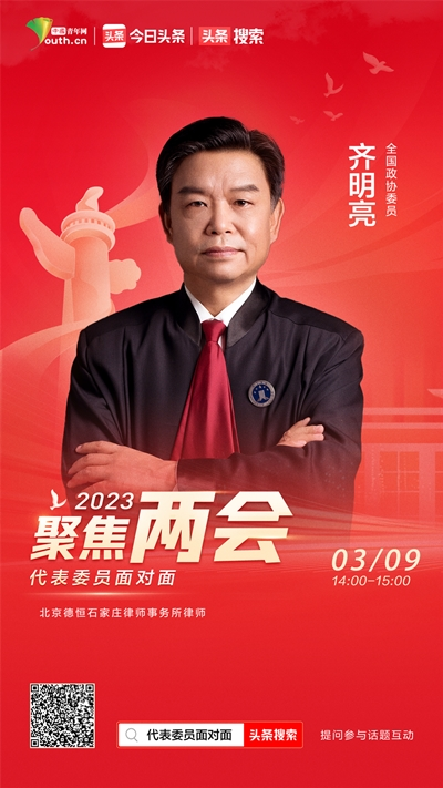 中國青年網北京3月9日電(記者 薛艷麗)3月9日,全國政協(xié)委員,河北省律師協(xié)會副會長,北京德恒(石家莊)律師事務所律師齊明亮做客中國青年網聯(lián)合今日頭條舉辦的線上“2023代表委員面對面”微訪談活動,和大家分享今年全國兩會期間自己帶來的提案。
