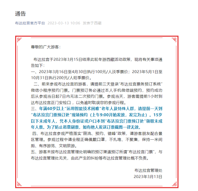 央視網(wǎng)消息:據(jù)布達(dá)拉宮官方平臺(tái)微信公眾號(hào)消息,布達(dá)拉宮于2023年3月15日結(jié)束此輪冬游西藏活動(dòng)政策,現(xiàn)將有關(guān)事項(xiàng)通告如下: