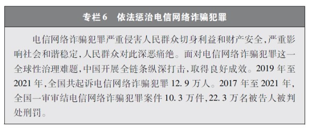守護公民財產(chǎn)安全。持續(xù)加大立法保護力度,遏制利用網(wǎng)絡侵犯財產(chǎn)權(quán)益的行為。2018年出臺電子商務法,規(guī)定電子商務經(jīng)營者銷售的商品或者提供的服務應當符合保障人身、財產(chǎn)安全的要求。民法典明確利用網(wǎng)絡侵害他人財產(chǎn)權(quán)益的行為應當承擔相應法律責任。2022年出臺反電信網(wǎng)絡詐騙法,為打擊電信網(wǎng)絡詐騙活動提供有力法律支撐,切實維護人民群眾的財產(chǎn)權(quán)益。