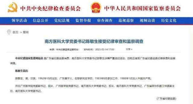 3月14日,中央紀(jì)委國(guó)家監(jiān)委發(fā)布兩則涉及醫(yī)藥衛(wèi)生領(lǐng)域干部被查的消息,落馬官員分別為南方醫(yī)科大學(xué)黨委書記陳敏生,廣西壯族自治區(qū)醫(yī)療保障局原黨組書記、局長(zhǎng)王忠平。