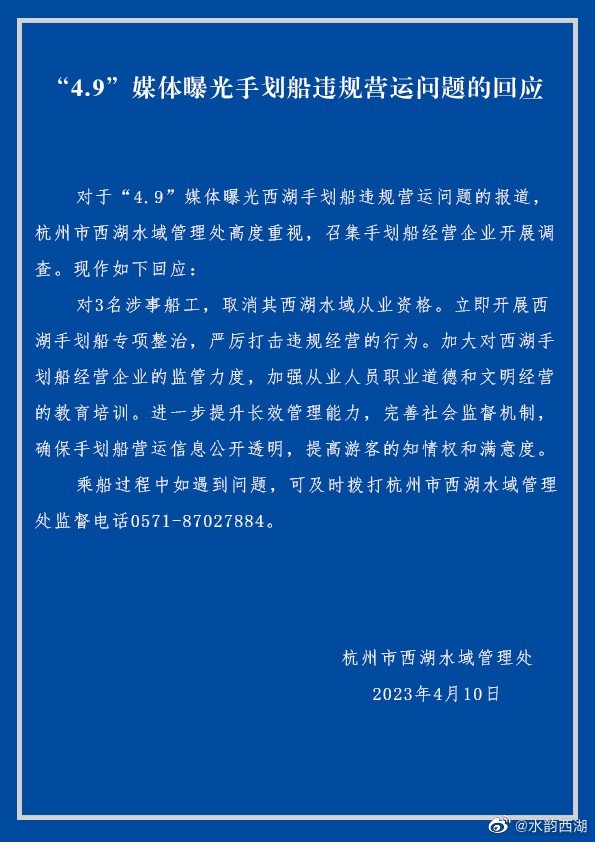 官方通報:杭州西湖涉事船工被取消從業(yè)資格