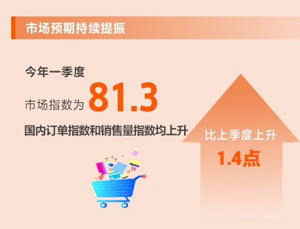 今年以來經(jīng)濟(jì)循環(huán)加快暢通,市場需求逐步恢復(fù),消費(fèi)勢頭有所好轉(zhuǎn),市場預(yù)期明顯恢復(fù)。一季度,市場指數(shù)為81.3,環(huán)比上升1.4點(diǎn)。所調(diào)查的8個(gè)行業(yè)中,國內(nèi)訂單指數(shù)和銷售量指數(shù)均上升,7個(gè)行業(yè)銷售價(jià)格指數(shù)上升。