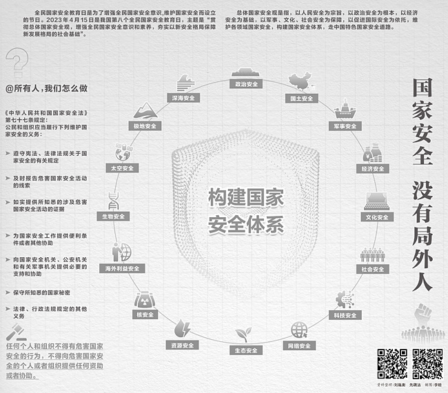 全民國家安全教育日是為了增強(qiáng)全民國家安全意識,維護(hù)國家安全而設(shè)立的節(jié)日。2023年4月15日是我國第八個(gè)全民國家安全教育日,主題是“貫徹總體國家安全觀,增強(qiáng)全民國家安全意識和素養(yǎng),夯實(shí)以新安全格局保障新發(fā)展格局的社會基礎(chǔ)”。