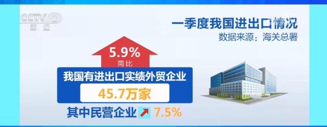 一季度,我國貨物進出口總額98877億元。其中,出口56484億元,同比增長8.4%,保持了較快增長,特別是我國對“一帶一路”沿線國家進出口增長16.8%,對RCEP其他成員國的進出口增長7.3%。同時,我國外貿(mào)競爭新優(yōu)勢、增長新動能不斷培育壯大。一季度電動載人汽車、鋰電池、太陽能電池出口同比分別增長122.3%、94.3%和23.6%,合計增長66.9%,同比增量超過1000億元,拉高了出口整體增速2個百分點。此外,一季度,我國有進出口實績外貿(mào)企業(yè)45.7萬家,同比增長5.9%。其中,民營企業(yè)增加7.5%,外貿(mào)經(jīng)營主體數(shù)量穩(wěn)中有增,顯示外貿(mào)“熱度”穩(wěn)步提升。