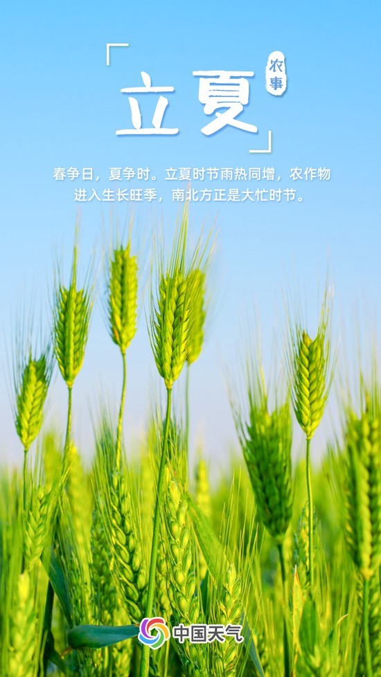 如果說春是生的季節(jié),那么夏就是長的季節(jié)?!稓v書》曰:“斗指東南,維為立夏,萬物至此皆長大,故名立夏也?!绷⑾模菢?biāo)示萬物進(jìn)入旺季生長的一個(gè)重要節(jié)氣。此時(shí),日照增加、氣溫漸升、雷雨增多,農(nóng)作物進(jìn)入了茁壯成長階段。春播作物漸漸長大,夏收作物進(jìn)入生長后期,冬小麥揚(yáng)花灌漿,油菜接近成熟,大江南北都進(jìn)入了農(nóng)事繁忙時(shí)期。