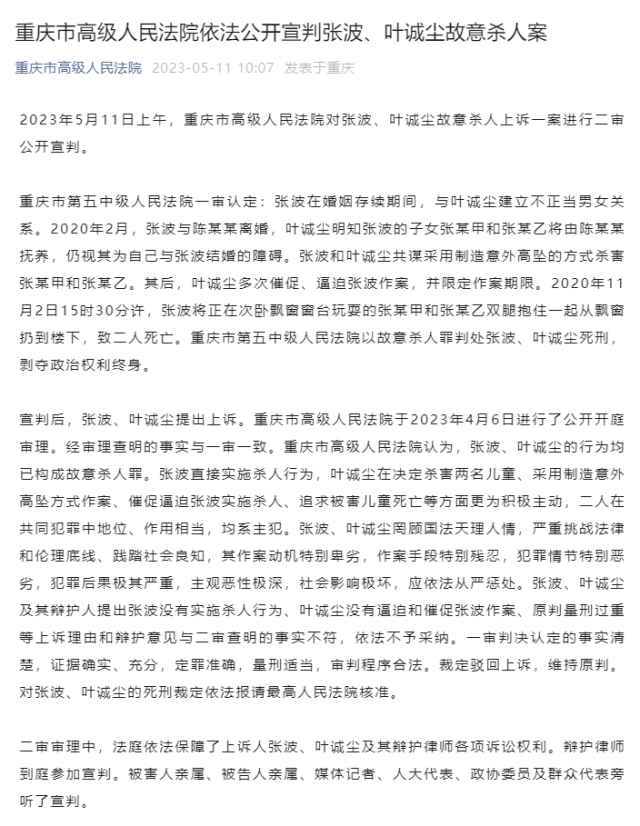 宣判后,張波、葉誠塵提出上訴。重慶市高級人民法院于2023年4月6日進行了公開開庭審理。經(jīng)審理查明的事實與一審一致。重慶市高級人民法院認為,張波、葉誠塵的行為均已構(gòu)成故意殺人罪。張波直接實施殺人行為,葉誠塵在決定殺害兩名兒童、采用制造意外高墜方式作案、催促逼迫張波實施殺人、追求被害兒童死亡等方面更為積極主動,二人在共同犯罪中地位、作用相當(dāng),均系主犯。張波、葉誠塵罔顧國法天理人情,嚴重挑戰(zhàn)法律和倫理底線、踐踏社會良知,其作案動機特別卑劣,作案手段特別殘忍,犯罪情節(jié)特別惡劣,犯罪后果極其嚴重,主觀惡性極深,社會影響極壞,應(yīng)依法從嚴懲處。張波、葉誠塵及其辯護人提出張波沒有實施殺人行為、葉誠塵沒有逼迫和催促張波作案、原判量刑過重等上訴理由和辯護意見與二審查明的事實不符,依法不予采納。一審判決認定的事實清楚,證據(jù)確實、充分,定罪準確,量刑適當(dāng),審判程序合法。裁定駁回上訴,維持原判。對張波、葉誠塵的死刑裁定依法報請最高人民法院核準。