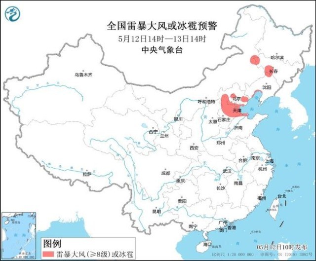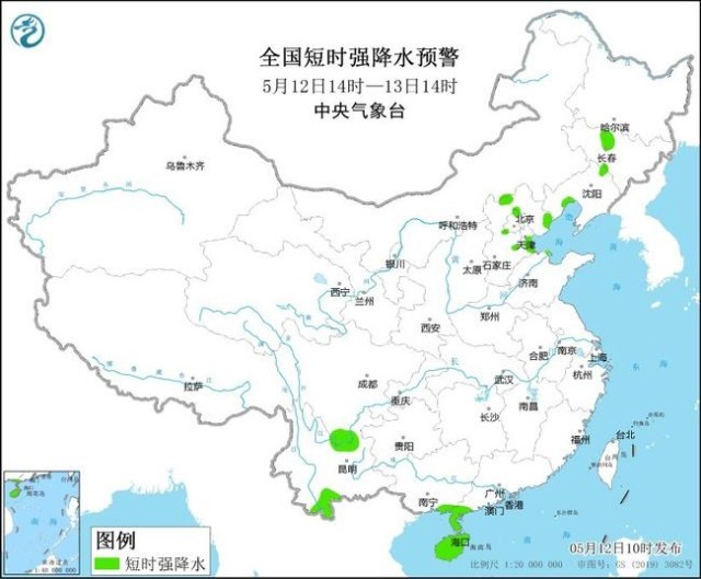 預(yù)計(jì)5月12日14時(shí)至13日14時(shí),河北中部和東北部、北京西北部和南部、天津南部、吉林中西部、遼寧西北部、山東北部等地的部分地區(qū)將有8-10級雷暴大風(fēng)或冰雹天氣;吉林中部、遼寧西部、河北中北部、北京西北部、天津南部、山東北部、四川南部、云南南部、廣西東南部、廣東西南部、海南島等地的部分地區(qū)將有短時(shí)強(qiáng)降水天氣,小時(shí)雨量20-40毫米,局地可達(dá)50毫米以上。